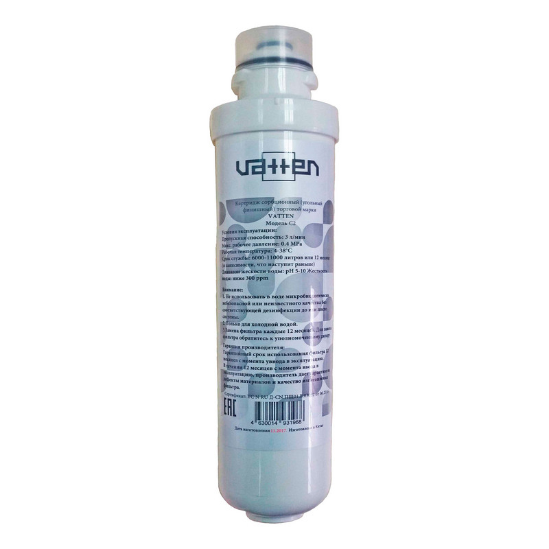 Фильтр для пурифайера Vatten C2 сорбционный, угольный финишный обеспечивает чистую, свежую, высокого качества воду. Ресурс данного картриджа 6000 - 11000 литров или 12 месяцев. Картридж с активированным углем для финишной доочистки, но без умягчения водопроводной воды.Внешний вид и/или характеристики товара могут быть изменены производителем в соответствии с производственным процессом.