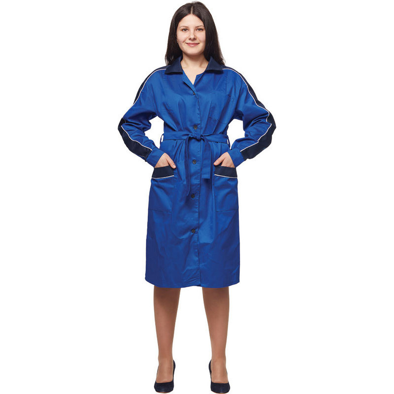 Халат с центральной застежкой на пуговицах,отложным воротником, нагрудным и двумя нижними накладными карманами. Рукава и карманы оформлены декоративной отделкой. Ткань:смесовая 80% полиэстер, 20% хлопок, плотность: 200 г/м.В коллекции у03 представлены женская линейка в васильковом цвете с темно-синей отделкой и мужская в темно-синем цвете у03-ХЛ.