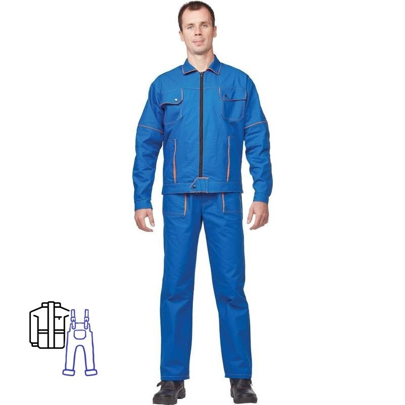 Спецодежда летняя костюм мужской л06-КПК (куртка+ полукомбинезон). Размер: 44-46. Рост: 170-176. Куртка прямого силуэта с застежкой на 'молнию'. На левом рукаве двухсекционный карман с клапаном Пояс куртки регулируется по ширине застежками-хлястиками Полукомбинезон с застежкой гульфика на пуговицы, с одним нагрудным карманом на клапане и двумя боковыми карманами Ткань: саржа (100% хлопок) Плотность ткани: 240 г/м2. Цвет: васильковый, отделка: оранжевый. Температурный режим стирки - не выше 40 градусов. Сферы применения: сельское хозяйство, логистика, легкая промышленность, строительство, озеленение, автомобильная.Есть заключение Минпромторга России для получения компенсации от ФСС на охрану труда .В коллекции л06 представлены комплекты: куртка с брюками л06-КБР и куртка с полукомбинезоном л06-КПК в васильковом и зеленом цветах.
