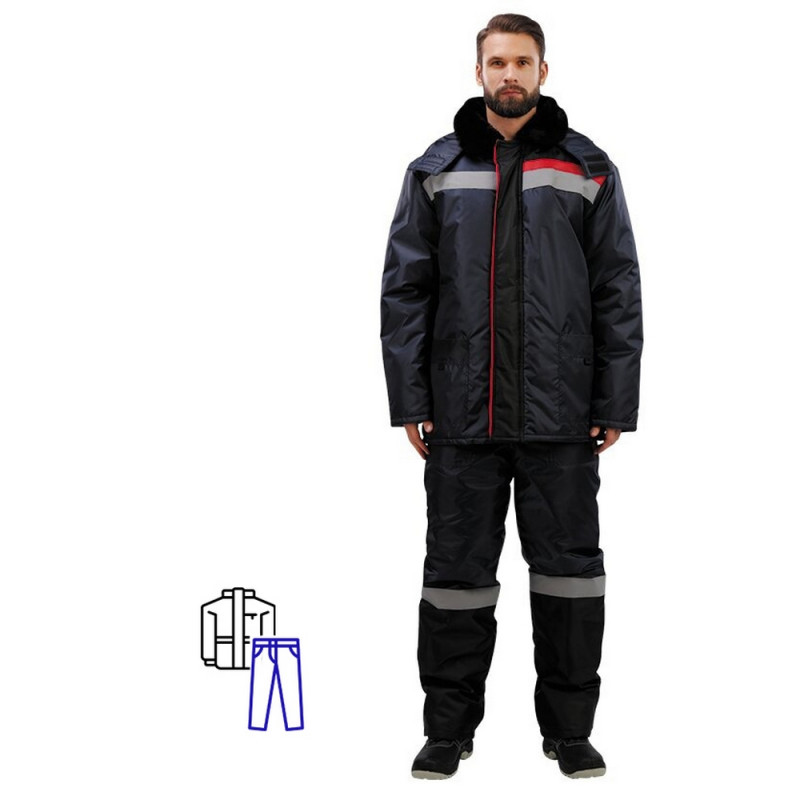 Спецодежда зимняя костюм мужской з02-КБР состоит из куртки и брюк (размер 60-62, рост 182-188) синего цвета с черными и красными вставками. Изготовлен из ткани Оксфорд (100% полиэстер), плотность ткани - 110 г/кв.м. Утеплитель - синтепон, плотность утеплителя куртки - 200 г/кв.м (2 слоя), брюк - 200 г/кв.м (1 слой). Материал подкладки - 100% полиэстер. Светоотражающая полоса размещена на груди, спине, а также внизу брюк. Куртка прямого силуэта с центральной застежкой на молнии. Меховой воротник и капюшон, отстегивающийся при необходимости, хорошо защищают от холода. Внизу рукава есть трикотажные напульсники, которые предотвращают попадание холодного ветра внутрь. Брюки имеют прямой силуэт с высоким поясом и центральной застежкой на пуговицах. Костюм обеспечивает защиту от пониженных температур и производственных загрязнений. Стандарты: ГОСТ 12.4.303-2016, ТР ТС 019/2011.