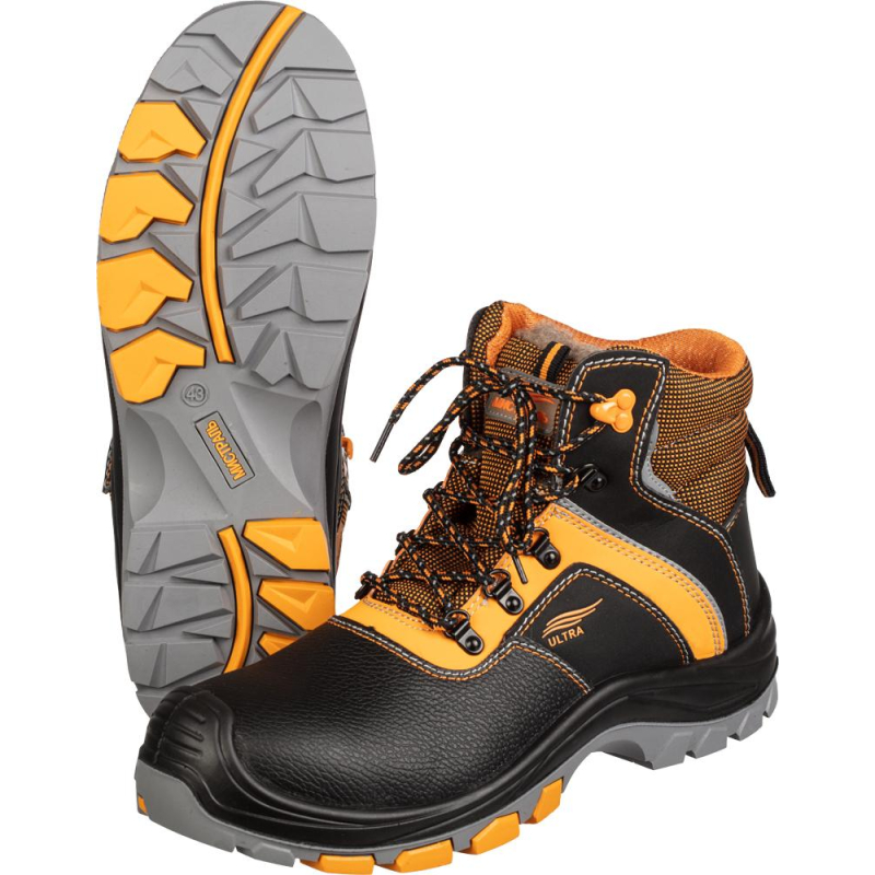 Ботинки Мистраль Ultra предназначены для работы в любой отрасли, но не предназначены для сварочных работ и работ с высококонцентрированными кислотами. Выполнены в черном и оранжевом цвете. Размер 40. Материал верха- термоустойчивая водоотталкивающая натуральная кожа (юфть) толщиной 1,8-2,0 мм. Вставки из микрофибры. Высота ботинка- 17 см. Подошва - двухслойная, устойчивая к воздействию нефти, нефтепродуктов, щелочей концентрации до 20%, повышенных температур. Верхний слой из полиуретана обладает амортизирующими свойствами, гасит ударные нагрузки, а также придает обуви легкость, комфортность и повышенные теплозащитные свойства. Ходовой слой изготовлен из износостойкой, термостойкой (+300°С / 60 с), морозостойкой резины на основе нитрильного каучука с улучшенным сопротивлением скольжению, стойкостью к деформациям, истиранию. Носочная часть имеет дополнительную защиту в виде полиуретановой накладки, предотвращающей механические повреждения обуви и препятствующей проникновению холода. Для защиты от ударов в носочной части стопы в обуви применяется композитный (поликарбонатный) подносок (Мун 200), имеющий конфигурацию, препятствующую надавливанию верхнего края на стопу, и оборудованный прокладкой из полиуретана. Соответствует стандартам ТР ТС 019/2011. Срок эксплуатации после выдачи обуви составляет 70 дней при соблюдении правил ухода, эксплутации и хранения. Цвет на изображении товара в интернет-магазине или в печатном каталоге может отличаться от оригинала из-за особенностей цветопередачи монитора.