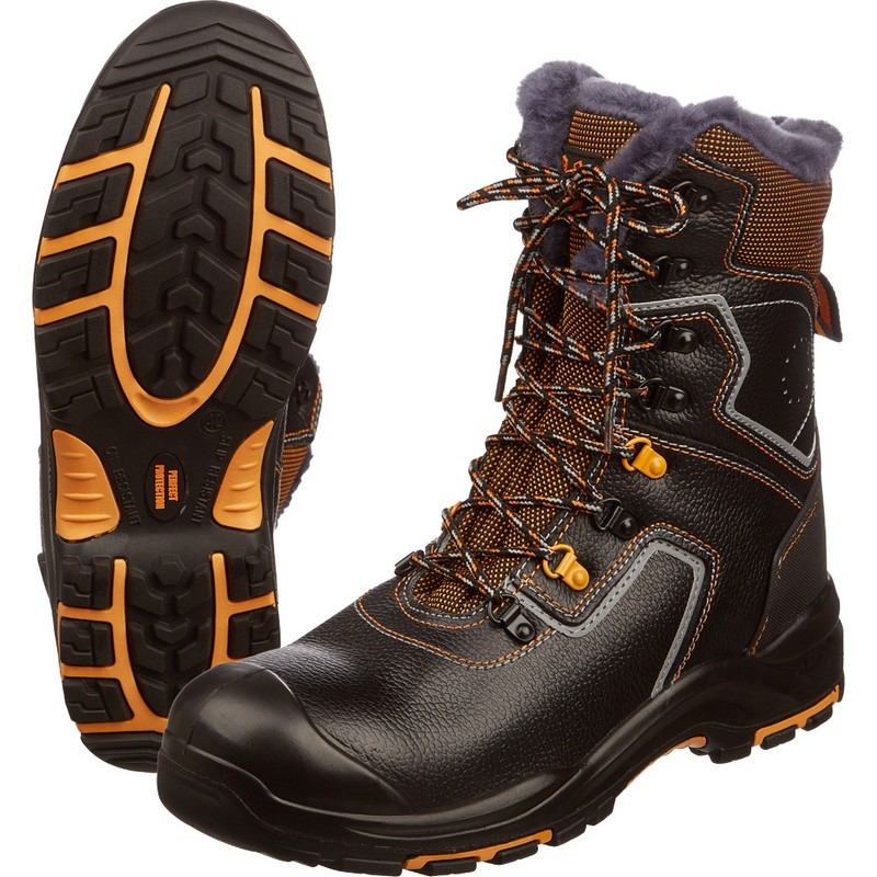 Ботинки модели Perfect Protection с высоким берцем подходят и для мужчин, и для женщин. Выполнены в черном цвете с желтыми элементами. Размер 40. Рекомендуется использовать в строительстве, ЖКХ, нефтегазовой промышленности, в логистике и озеленении территории. Верхняя часть изготовлена из натуральной кожи. Материал хорошо пропускает воздух, не боится механических повреждений, долго служит. Утеплитель из натурального меха обладает высокими гигиеническими свойствами, хорошо удерживает тепло в условиях низких температур (до -30 °C). Противоударный поликарбонатный подносок защищает ноги от ударов силой в 200 Дж. Берцы надежно фиксируют голеностоп шнурками, не нарушая при этом естественную подвижность ноги. Подошва из полиуретана с нитрилом устойчива к воздействию масла, бензина, кислот, щелочей. Она выдерживает прямые контакты с нагретыми поверхностями (до 300 °C). Обувь выдерживает температурные режимы от -40 до 300 °C (в течение 60 секунд). Подошва не скользит и обеспечивает устойчивость при ходьбе. Полиуретан в промежуточном слое обеспечивает легкость. Нитрильная резина в ходовой части устойчива к многократным изгибам, деформациям, истиранию. Литьевой метод крепления подошвы обеспечивает надежное скрепление, а значит долгий срок службы и высокую гибкость, тем самым уменьшая усталость ног. Металлическая стелька защищает от проколов. Климатический пояс - 2,3,4 и Особый. Данная модель предназначена для защиты от ударов в носочной части (Мун 200), низких температур (Тн), общих производственных загрязнений (З). На ботинки предоставляется гарантия 70 дней при условии соблюдения правил эксплуатации, ухода, хранения. Соответствуют стандартам ТР ТС 019/2011. Цвет на изображении товара в интернет-магазине или в печатном каталоге может отличаться от оригинала из-за особенностей цветопередачи монитора.