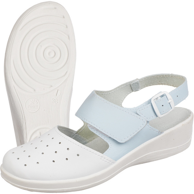 Туфли сабо модели Бэлла являются удобной женской обувью и используются в медицинских учреждениях, в легкой промышленности и как повседневная обувь. Выполнены в белом цвете с голубым ремешком. Размер 39. Изготавливаются из натуральной кожи. Регулируемый ремешок сзади для фиксации пятки, передний ремешок на липучке позволяет регулировать подъем ноги. Союзка выполнена с перфорацией для вентиляции ноги. Подошва на танкетке литьевого метода крепления, с четким нескользящим протектором, на облегченном ПВХ, выдерживающий температурный режим при литье от 160 до 180 °C. В коллекции сабо Бэлла представлены модели в различных цветовых сочетаниях: белый с розовой отделкой, белый с голубой и зеленой отделками, полностью белые. Срок эксплуатации 90 дней, срок хранения 36 месяца при соблюдении условий эксплуатации, хранения и транспортировки. При длительном воздействии пониженных температур от -20 °C материал, из которого изготовлена обувь, теряет свои свойства и становится хрупким. ПРедназначены для защиты от общих загрязнений. Соответствуют стандартам ТР ТС 017/2011. Цвет на изображении товара в интернет-магазине или в печатном каталоге может отличаться от оригинала из-за особенностей цветопередачи монитора.