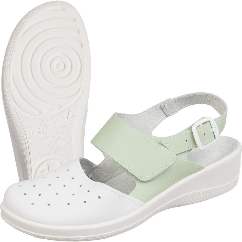 Туфли сабо модели Бэлла являются удобной женской обувью и используются в медицинских учреждениях, в легкой промышленности и как повседневная обувь. Выполнены в белом цвете с зеленым ремешком. Размер 37. Изготавливаются из натуральной кожи. Регулируемый ремешок сзади для фиксации пятки, передний ремешок на липучке позволяет регулировать подъем ноги. Союзка выполнена с перфорацией для вентиляции ноги. Подошва на танкетке литьевого метода крепления, с четким нескользящим протектором, на облегченном ПВХ, выдерживающий температурный режим при литье от 160 до 180 °C. В коллекции сабо Бэлла представлены модели в различных цветовых сочетаниях: белый с розовой отделкой, белый с голубой и зеленой отделками, полностью белые. Срок эксплуатации 90 дней, срок хранения 36 месяца при соблюдении условий эксплуатации, хранения и транспортировки. При длительном воздействии пониженных температур от -20 °C материал, из которого изготовлена обувь, теряет свои свойства и становится хрупким. ПРедназначены для защиты от общих загрязнений. Соответствуют стандартам ТР ТС 017/2011. Цвет на изображении товара в интернет-магазине или в печатном каталоге может отличаться от оригинала из-за особенностей цветопередачи монитора.