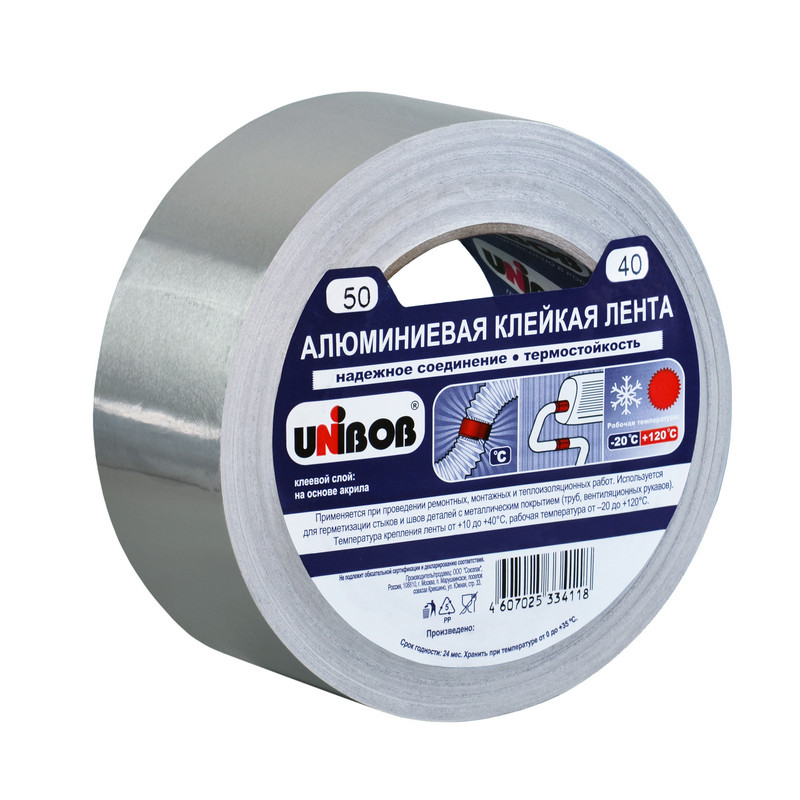 Клейкая высокопрочная алюминиевая лента Unibob. Алюминиевая клейкая лента применяется при проведении ремонтных, монтажных и теплоизоляционных работ. Металлизированная лента используется для герметизации стыков и швов деталей с металлическим покрытием (труб, вентиляционных рукавов). Обеспечивает надежное соединение и термостойкость. Клеевой слой на основе акрила обеспечивает отличную адгезию ко всем поверхностям. Лента на акриловой основе демонстрирует лучшие показатели стабильности при работе в агрессивных средах, именно поэтому ее чаще всего выбирают для длительной, стабильной склейки поверхностей, которым не должны угрожать различные условия окружающей среды. Основные преимущества продукта Обеспечивает надежное соединение стыков и швов деталей с металлическим покрытием (труб, воздуховодов). Морозоустойчива и термостойкая. Обеспечивает защиту частей оборудования от проникновения пара, грязи, пыли и влаги. Устойчива к стиранию и воздействию влаги. Клеевой слой на основе акрила обеспечивает отличную адгезию ко всем поверхностям. Цветная информативная этикетка. Каждый рулон упакован в термоусадочную пленку, что сохраняет все свойства и технические характеристика товара. Работая с клейкой алюминиевой лентой, необходимо следить за выполнением следующих правил: - не рекомендуется повторное использование ленты, если в этом нет острой необходимости (сцепление с поверхностью будет некачественным); - нельзя дотрагиваться незащищенными руками до клеевого слоя; - нужно следить, чтобы до начала работ клеевой слой не загрязнился, иначе адгезия с поверхностью ухудшится; - также перед проведением работ рекомендуется высушить, очистить и обезжирить поверхность, на которую будет наноситься лента; - если предполагается осуществление работ в помещениях с повышенной влажностью, то стоит выбрать другой способ герметизации или изоляции, так как алюминиевая клейкая лента утратит большую часть своих эксплуатационных характеристик. Температура крепления ленты: от 10 до 40 градусов по Цельсию. Рабочая температура: от 20 до 120 градусов по Цельсию. Толщина ленты - 70 мкм. Цвет: серый. Ширина - 50 мм. Длина намотки составляет 40 м. Количество лент в упаковке: 1 шт. Количество упаковок в транспортном коробе: 24.